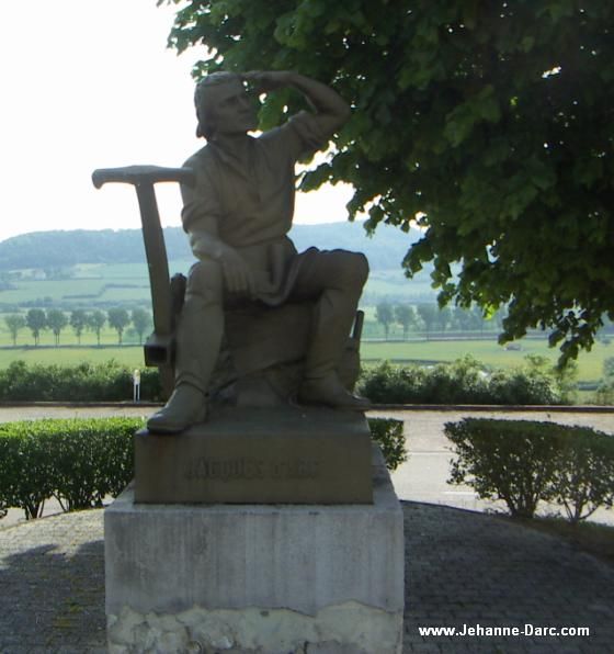 This Church, in which Joan was baptized, has undergone some transformations in the course of the centuries. Foremost among these is its change in orientation in 1824: the new choir is situated at the location of the original portal; the former choir was located on the threshold of the present-day portal. The vaults were rearranged as the dates of the vaults' key-stones indicate: in 1582; 1698; 1904. The façade windows (previously walled-up) were not discovered until 1956, the one on the right having kept its mullion and it's flowered tympanum. The semi-cylindrical turret (at the right on the outside of the church) gives access to the tower; the latter /the turret) appears to date from the XIII century. The stoup (to the right of the entrance) dates from the XIII century; it is of rough limestone, polished by the hands of the faithful... Behind the pillar, there is a fresco of Saint Sebastian dated 1586. Next to it's a statue of Saint Margaret, in front of which Saint Joan would come to pray. (Saint Margaret and Saint Catherine appeared to Joan). In the south (left-hand) transept, there is the baptismal font, a block of octagonal limestone upon which Joan was baptised (in 1412). On the wall you can see an ornate tombstone with the coat-of-arms of Thiesselin brothers, descendants of one of Joan's godmothers. Close by, a statue of Saint Remy, from the XVII century. At the entrance of the Choir, you will find two retable altars from the end of the XVI century. Let us not fail to notice the angels at the top of the Holy Virgin Mary's altar, who hold Joan of Arc's coat of arms. To your right, a statue of Saint Anne the same period. To the left of the altar of St Nicholas (patron Saint of the Lorraine), there is a polychrome statue from 1709 portraying Saint Elophe, a deacon martyred in 362 a few kilometres from Domremy. The stained-glass windows: Created by Gaudin in 1955, they depict the major events in the life of our Holy Heroine, except for the central window, which is by St Rémy (496), patron saint of this church, and which portrays the baptism of Clovis. On the left of the central stained-glass window: the apparition of Saint Michael; on the right, Our Lady of Bermont, before which Joan often prayed (see the statue in the Basilica's crypt). To the right, starting from the entrance: Vaucouleurs, then Chinon. On the other Side, starting from the choir: Orléans, followed by Reims. At the right-hand transept: the trial in Rouen; opposite, the stake, which recalls the passion of Joan (1431). The "last breath": As you enter on the left, note the 'last breath', created in Carrara marble by the sculptor Réan del Sarte, whereby Joan's head is crowned with a wreath of thorns and lilies. The pedestal, in onyx, contains earth from the pyre in Rouen. Link to Domrémy; www.domremy.org