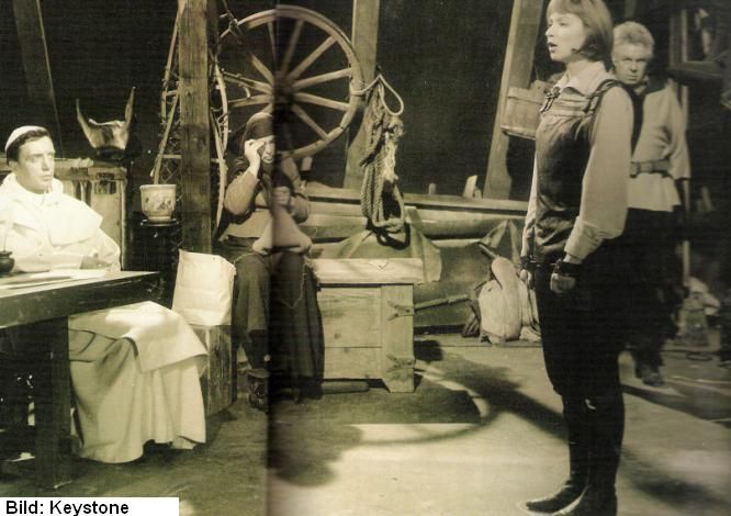 Bertolt Brecht has dealt thoroughly with the history of the Maid of Orléans. The life of the Jeanne d'Arc plays the leading role in the piece "a widely authentic Jeanne d'Arc to Rouen 1431." (Basis for the piece which Brecht wrote for the Berlin ensemble is a radio play by Anna Seghers.) Brecht describes here the questioning which Joan had to undergo. The statements of her voices and her order match word for word what was written down in the Episcopal protocol. Between the history-explaining narrations, Brecht lets the characters get a chance to speak. At the weekly market of Rouen, virginity is discussed. For example, Joan's "it means Lady Bedford has convinced himself personally that she is a virgin. It means that, besides, her spouse, our good duke of Bedford, by a specially invested opening in the floor also convinced himself." In another scene a fish woman talks with a farmer. The fish woman says, "Misery that she is a witch where she is, nevertheless, against the Englishmen." The farmer says, "Your voices come from the devil!" The fish woman says, "Bah, what her voices say, it does not seem different than what all people say, namely the fact that the Englishmen from France have to go out."