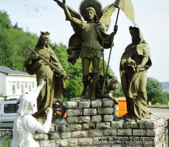 This Church, in which Joan was baptized, has undergone some transformations in the course of the centuries. Foremost among these is its change in orientation in 1824: the new choir is situated at the location of the original portal; the former choir was located on the threshold of the present-day portal. The vaults were rearranged as the dates of the vaults' key-stones indicate: in 1582; 1698; 1904. The façade windows (previously walled-up) were not discovered until 1956, the one on the right having kept its mullion and it's flowered tympanum. The semi-cylindrical turret (at the right on the outside of the church) gives access to the tower; the latter /the turret) appears to date from the XIII century. The stoup (to the right of the entrance) dates from the XIII century; it is of rough limestone, polished by the hands of the faithful... Behind the pillar, there is a fresco of Saint Sebastian dated 1586. Next to it's a statue of Saint Margaret, in front of which Saint Joan would come to pray. (Saint Margaret and Saint Catherine appeared to Joan). In the south (left-hand) transept, there is the baptismal font, a block of octagonal limestone upon which Joan was baptised (in 1412). On the wall you can see an ornate tombstone with the coat-of-arms of Thiesselin brothers, descendants of one of Joan's godmothers. Close by, a statue of Saint Remy, from the XVII century. At the entrance of the Choir, you will find two retable altars from the end of the XVI century. Let us not fail to notice the angels at the top of the Holy Virgin Mary's altar, who hold Joan of Arc's coat of arms. To your right, a statue of Saint Anne the same period. To the left of the altar of St Nicholas (patron Saint of the Lorraine), there is a polychrome statue from 1709 portraying Saint Elophe, a deacon martyred in 362 a few kilometres from Domremy. The stained-glass windows: Created by Gaudin in 1955, they depict the major events in the life of our Holy Heroine, except for the central window, which is by St Rémy (496), patron saint of this church, and which portrays the baptism of Clovis. On the left of the central stained-glass window: the apparition of Saint Michael; on the right, Our Lady of Bermont, before which Joan often prayed (see the statue in the Basilica's crypt). To the right, starting from the entrance: Vaucouleurs, then Chinon. On the other Side, starting from the choir: Orléans, followed by Reims. At the right-hand transept: the trial in Rouen; opposite, the stake, which recalls the passion of Joan (1431). The "last breath": As you enter on the left, note the 'last breath', created in Carrara marble by the sculptor Réan del Sarte, whereby Joan's head is crowned with a wreath of thorns and lilies. The pedestal, in onyx, contains earth from the pyre in Rouen. Link to Domrémy; www.domremy.org